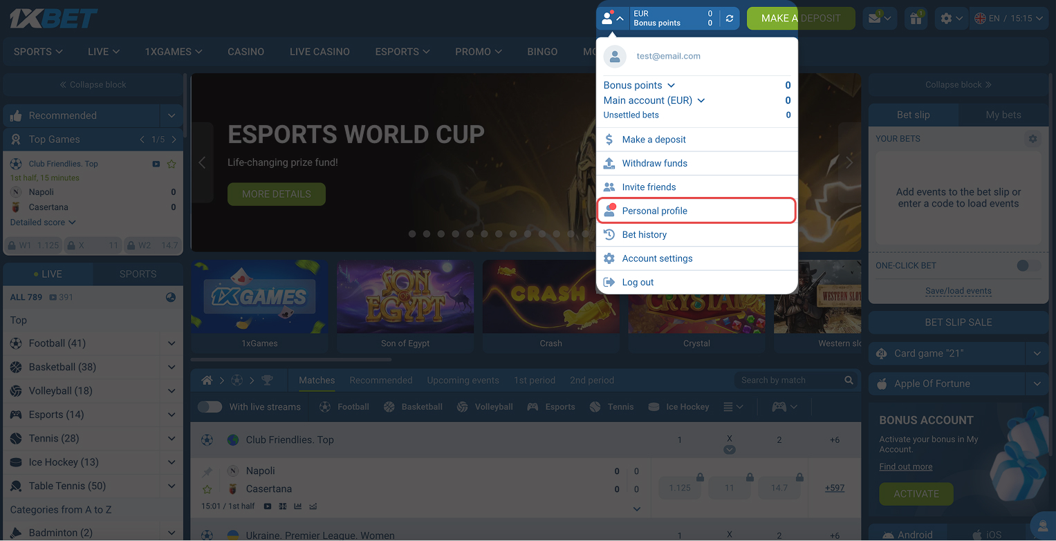 Log in to the 1xBet website and open your profile (the icon in the top right corner). Find your account number – this is your unique ID.
